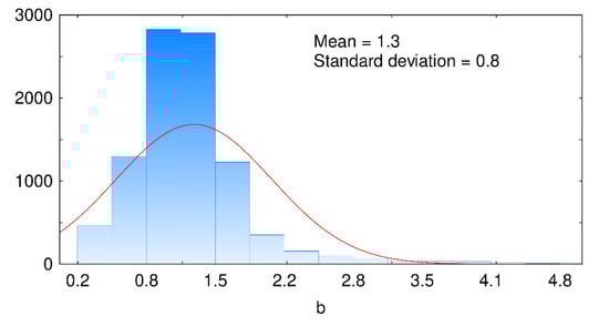 If one assumes that the macrohardness absolute error follows a power law having an exponent called b for values of Sq/hmax lower than 0.3 and if one tests this law for all the fractal dimensions and wavelength presented in Figure 7, then the histogram shown in Figure 8 is obtained. The average value of coefficient b is equal to 1.3, while its standard deviation is equal to 0.8. The identified coefficient is neither dependent on the fractal dimension values nor on the wavelength values. This identification means that the error committed on macrohardness determination increases by a power of 1.3 with the increase of the ratio Sq/hmax.