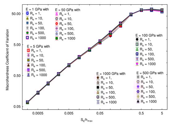 Coefficient of variation of the macrohardness as a function of the ratio Sq/hmax for different values of Young’s modulus E and elastic limit Re. The mesh size, wavelength, and fractal dimension were, respectively, set to 256 × 256, 32 µm, and 2.5.