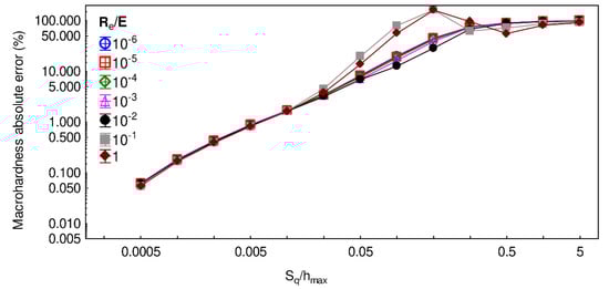 Macrohardness absolute error as a function of the ratio Sq/hmax for different values of Re/E ratio. The mesh size, wavelength, and fractal dimension were, respectively, set to 256 × 256, 32 µm, and 2.5.