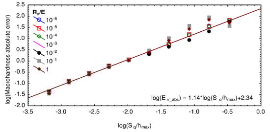 Logarithm of the macrohardness absolute error as a function of the logarithm of the ratio Sq/hmax for different values of Re/E ratio. The mesh size, wavelength, and fractal dimension were, respectively, set to 256 × 256, 32 µm, and 2.5.