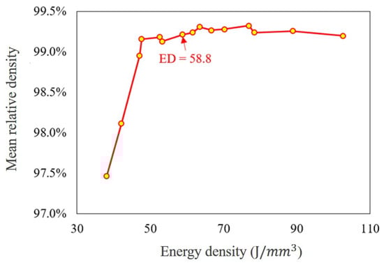 In order to determine the nominal parameters, a density test was performed after the samples were printed with parameters listed in Table 2. All the samples were cut off from the substrate with a Sodick VZ300L Wire Electric Discharge Machine (EDM). The density test was performed on the as-printed samples based on the Archimedes principle. The mean relative density results are illustrated in Figure 1 with a true powder density of 7.935 g/cm3 and the average of three samples. From the trend of the relative volumetric density along with the energy density indicated at the lower ED region, the relative density of the as-printed sample elevated with the increase of ED till 58.8 J/mm3. After that, the relative density was almost consistent (>99.0%) with negligible fluctuation. Therefore, the set of parameters for ED #8 was chosen as the nominal parameters in this study [53].