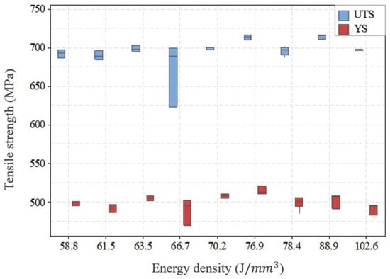 Tensile strength (yield strength (YS) and ultimate tensile strength (UTS)) of horizontal specimens with different parameters combination.
