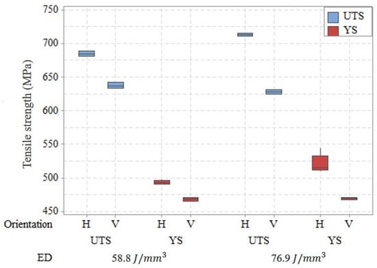 Tensile strength (YS and UTS) of horizontal and vertical specimens for energy densities 58.8 and 76.9 J/mm3.