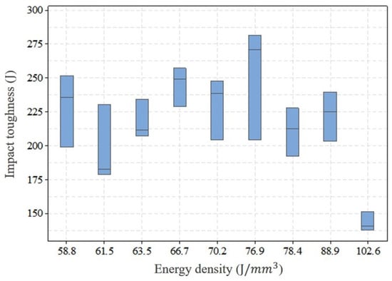 In order to determine the optimized parameters, tensile and impact toughness test was performed on the samples with ED above 58.8 J/mm3 included. Tensile testing was performed with miniature dog bone specimen as shown in Figure 2 [41]. The samples fabricated were machined to size with a nominal thickness of 1 mm. Three specimens were prepared for each parameter combination with the gauge length perpendicular to the build direction (horizontal specimen). Prior to the testing, the specimens were polished with 800 grit sandpaper. The Instron UTM machine was employed in this study to do tensile testing. The strain was controlled using an extensometer with a strain rate of 0.015 mm/min to 1% strain value. After that, the extensometer was removed and the testing was run with a cross-head speed of 1.5 mm/min. The tensile properties of the tested samples were represented by 0.2% offset yield strength (YS) and ultimate tensile strength (UTS). From the tensile test result of horizontal specimens with different energy density combinations as shown in Figure 3, it can be seen that no significant differences in YS and UTS can be recognized within the current ED range though there is a large scatter in results at an energy density of 66.7 J/mm3. The possible reason could be the quality of the printed part affected by the location on the build plate and the relative location of the gas flow [36]. However, the median of YS and UTS at horizontal orientation reached the maximum value at 76.9 J/mm3 in comparison with other parameter combinations while the difference in UTS and YS for the vertical orientation (shown in Figure 4) at 58.8 and 76.9 J/mm3 is negligible. Therefore, a further check was performed on vertical orientation by Charpy testing to the as-printed sample to demonstrate the parameter set optimized for impact toughness according to ASTM Standard E23. The longest axis of the Charpy specimen was printed along the build direction. A 2 mm “V” notch was machined with a standard broach. Three specimens were tested at each ED. The result of impact toughness from Charpy testing is illustrated in Figure 5. A relatively larger variation of impact toughness was observed for all ED. The median toughness achieved the optimal value at 76.9 J/mm3. Hence, 76.9 J/mm3 was demonstrated to be an optimized parameter set for both tensile strength and toughness.