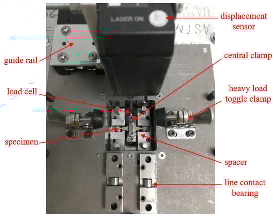 An additional advantage of using miniature specimens is that it requires a lower range of force; thus it minimizes the test setup cost. A subwoofer with low power capacity was employed as an actuator in this study. The subwoofer is a low-frequency drive. The mechanical modeling of a subwoofer is relatively similar to an electrodynamic shaker but the shaker has more rigid moving parts. Since higher rigidity requires higher force, the subwoofer with soft mechanical suspension is a well fitted low-cost alternate of a shaker. In order to utilize the woofer as the actuator, a plastic flange of 76.2 mm diameter replaced the cap of the voice coil. The flange of relatively larger diameter (3 times) compared to the effective length of the specimen (25.4 mm) along with the cone (254 mm diameter) supports the one-dimensional movement of the specimen. On top of the flange, the moving parts were mounted. A load cell fixed between the flange and the clamp of the central part measures the force applied on the specimen. Figure 7 illustrates the test setup with a specimen installed for simply supported bending type fatigue testing. While the specimen at the center was in surface contact (7 mm along the width and 3 mm along at length) with the central fixture, both ends maintained a line contact with bearings to ensure simply supported condition. In order to avoid any preloading on the specimen, spacers were used at both ends. The other two bearing holders were placed on top of the spacers. Finally, the heavy load toggle clamps fixed both ends of the test setup with the structure well. A high-speed laser-based displacement sensor pointing at the central clamp measured the displacement of the specimen. A proportional derivative (PD) controller was implemented to maintain the required set displacement while the load cell was used to measure the amplitude of the force applied. For further analysis, the displacement, load, and control signal amplitudes were recorded in a computer until the final failure of the specimen.