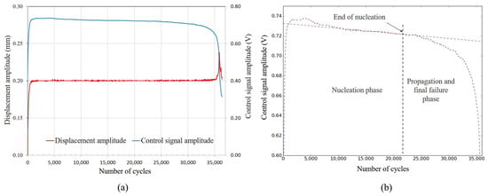 Controller response; (a): amplitude of the control signal and displacement for the horizontal specimen built with nominal parameter and (b): identification of the nucleation and propagation phase.