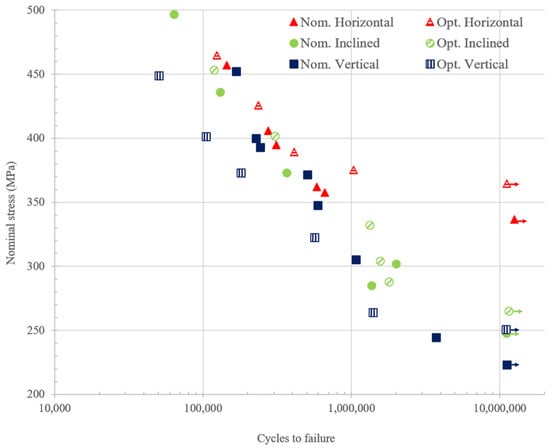 where, σ, F, h, and k are the nominal stress, load amplitude, thickness of the specimen, and the slope of the wedge shape. Figure 9 shows the Wohler curve of the specimens tested for different build orientations fabricated with nominal and optimized parameters. As we can see, for both the nominal and optimized parameters, horizontal specimens demonstrate higher fatigue strength than the inclined and vertical specimens while inclined specimens have higher strength than vertical ones.