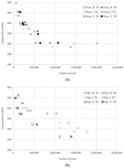 Nucleation phase and propagation and final failure phase of the specimens built with (a): nominal parameters and (b): optimized parameters. is the number of cycles at the end of the nucleation phase and is the number of cycles at the final failure of the specimen.