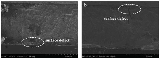 Scanning electron microscopic (SEM) images of fracture surfaces of the fatigue specimens fabricated with nominal and optimized parameters are shown in Figure 11 and Figure 12, respectively. Figure 11a,c,e exhibit the fracture surface of the horizontal, vertical, and inclined orientation specimens, respectively while the fracture surface for the horizontal and inclined specimens built with optimized parameters are shown in Figure 12a,b, respectively. In Figure 11b,d,f, nominal specimens with all orientations (horizontal, vertical, and incline) show that possible crack initiation sites are located around the lack-of-fusion defects close to the surface (circled by dashed lines). The initiation is a combined effect of higher nominal stress near the specimen surface and the stress concentration effect of defects. Especially in Figure 11b,f, unmelted powder particles can be found. While for the specimens built with optimized parameters, there is no obvious sign of lack-of-fusion type defects near the possible crack initiation sites, since the higher energy density provided for the optimized parameters can reduce the probability of the generation of lack-of-fusion. The initiation sites of specimens for optimized parameters mainly locate at the surface defect such as surface cracks (shown in Figure 12a,b). The fracture surface analysis reveals the possible reasons for the material fabricated with optimized parameters exhibiting higher fatigue strength at all different directions when compared with the material fabricated with nominal parameters.