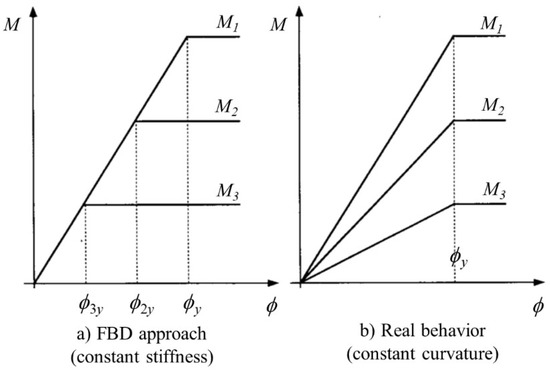 Influence of strength on the moment–curvature response (a) constant stiffness, and (b) constant curvature approaches [6,7].