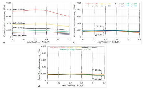 When the influence of the axial load level on the equivalent yield curvature was investigated, the yield curvatures slightly increased (less than 10%) up to P/Agfc′ ≤ 0.3. For the further axial load levels, the curvatures decreased up to ≈20% in comparison to the non-axial load case. This outcome can be extensively supported by the results of research conducted by others [14,17,20,22,32,33]. However, some researchers [6,12,33,34] have reported that a moderate level of axial compression loads does not significantly affect the equivalent yield curvature. Considering the cross-sectional height—the equivalent yield curvature responses in each axial load level—although the equivalent curvatures rapidly decreased up to the height of 125 cm, they remained limited for larger column dimensions. Based on the analysis results, the combined influences of the cross-sectional dimension and longitudinal reinforcement ratio had no significant impact on the yield curvature (Figure 9).