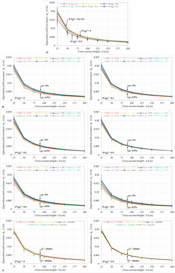 Considering the variations of equivalent yield curvatures determined for the particular cross-sectional heights in each axial load level, although the equivalent curvatures rapidly decreased up to the section height of 125 cm, the changes remained limited for further dimensions (Figure 6a). Here, while the equivalent curvatures between two lower section heights (h = 25–50 cm) relatively decreased by nearly 51%, these changes among h = 50–75, 75–100, 100–125, and 125–150 cm were roughly determined to be 33%, 26%, 20%, and 18%, respectively. It can be noted that the relative changes calculated for the equivalent yield curvature had similar ratios for all axial load levels.