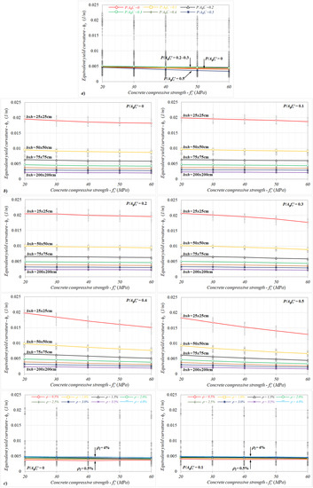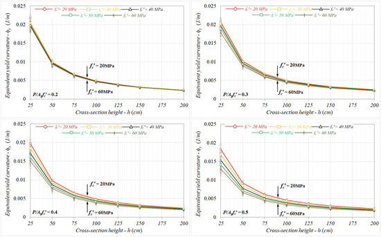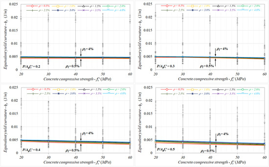 When the analysis results were taken into consideration in terms of the concrete compressive strength, as shown in Figure 5c, despite the equivalent yield curvatures increasing by up to 10% for P/Agfc′ ≤ 0.3, they exhibited a decreasing trend for axial load levels preceding the concrete crushing, depending on the compressive strength. In this region, while the relative changes were limited by −1.2% in comparison to the non-axial load cases, the differences calculated could reach up to −22% for the case of fc′ = 60 MPa. This outcome means that the combined effect of the axial load and concrete compressive strength on the equivalent yield curvature is important.
