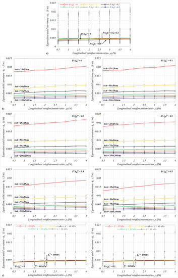 For lower axial load ratios (P/Agfc′ ≤ 0.3), where the reinforcement yield governed the yield condition, as shown in Figure 7c, the reinforcement ratio–curvature responses obtained for different concrete compressive strengths were pretty close to each other (less than 10%). In contrast to this behavior, in the case of further axial load levels (P/Agfc′ > 0.3), the yield curvatures decreased as the concrete compressive strength increased for each reinforcement ratio. It can be noted here that the general characteristic relation to the curvature responses did not have a significant influence. However, the equivalent curvatures exhibited an increasing trend as the reinforcement ratio increased for each compressive strength (Figure 7c). It can also be noted that the relative changes may increase up to 30% between the curvatures calculated for the smallest and largest reinforcement ratios (ρl = 0.5% and 4%), depending on the concrete compressive strength. Here, the combined effect of the axial load ratio and compressive strength became evident for the each reinforcement ratio.