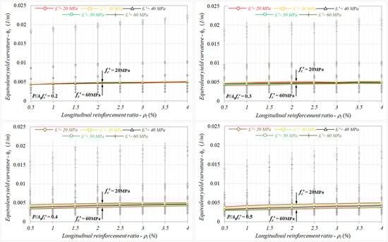 Accordingly, discussions with respect to the considered response parameters were conducted for two particular zones: P/Agfc′ ≤ 0.3 and P/Agfc′ > 0.3. The variations of yield curvatures with the related parameters and the comparisons were presented for the constant yield strength of reinforcement. It is well-known not only that the general characteristics belonging to the response will not change in the cases of lower or higher yield strength reinforcements, but also that the equivalent curvature will increase as the yield strength increases [6,7,10,13]. The influence of each parameter on the curvature response was evaluated by using the median values statistically.