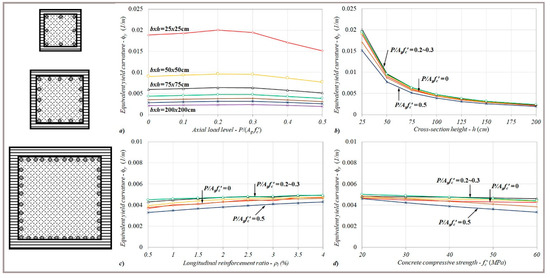 For the square column sections ranging from bxh = 25 × 25 to 200 × 200 cm, the variations of the equivalent yield curvature with the cross-sectional height (h) are given in Figure 6a–c from the perspective of the particular axial load levels, longitudinal reinforcement ratios, and concrete compressive strengths.