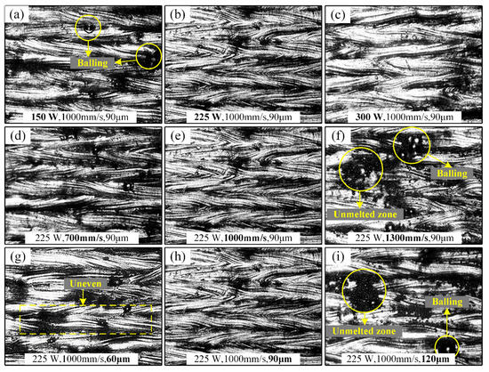 For different values of S (60 μm, 90 μm, 120 μm), surface morphologies of samples (Nos. 13, 17, 14) are shown in Figure 4g–i. When S is 60 μm, the uneven morphology (Figure 4g) on the single track can be clearly seen, confirming the unstable molten pool phenomenon. As S increases to 90 μm, the morphology becomes smoother and more uniform, as shown in Figure 4h. However, when S further increases to 120 μm, unmelted zones and balling (Figure 4i) begin to occur on the surface, proving that the laser energy supplied is not enough to melt the powder.