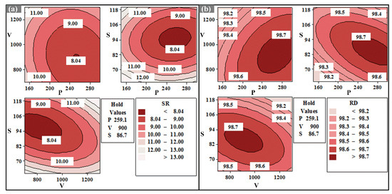 Contour plots of (a) SR and (b) RD at hold values of P (259.1 W), V (900 mm/s), and S (86.7 μm), respectively.