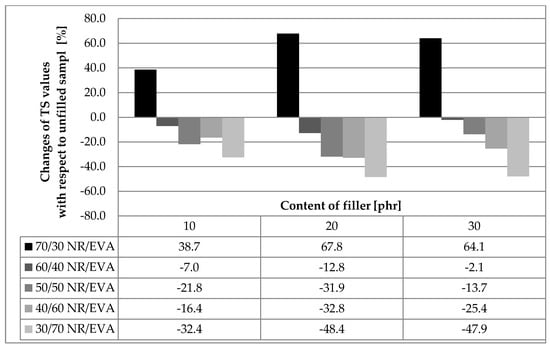 The results of mechanical properties for the tested composites are presented in Table 2. In the case of unfilled blends, the tensile strength increased with increasing EVA content in the composite. The reason for the low mechanical strength at high relative elongation is the low degree of physical crosslinking due to the EVA phase in glassy-crystalline state at room temperature. Thus, the TS value of the NR/EVA 70/30 composite was only 3.5 MPa, and the composite with inverse polymer proportions was over three times higher—12.0 MPa. On the other hand, from the strengthening point of view, the addition of straw in the case of samples with the same or preponderant content of EVA copolymer with respect to rubber content was proved to be unfavorable. Embedding 10 phr of straw into the NR/EVA 30/70 composite reduced the TS value by 32%. The addition of straw component to 20 and 30 phr reduced TS by as much as about 50% compared to the unfilled system (Figure 1). However, for samples NR/EVA 40/60 and NR/EVA 50/50, the negative effect of the biofiller was already much smaller, ranging from 16 to 32% (Table 1 and Figure 1). Composites containing more NR had initially less strength, but the addition of straw led to the most beneficial when compared to the corresponding straw-free blends. Sample NR/EVA 70/30, which had the lowest TS value without filler, after the addition of 20 and 30 phr straw was already as strong as samples containing more EVA with the same degree of filling. The large differences in the strength of unfilled composites substantially decreased as a result of the addition of almost the same values around 6 MPa (see Table 1 and Figure 1).