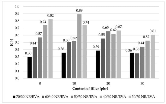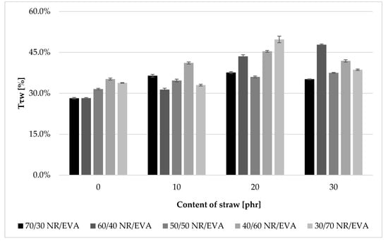 The relative damping of filler-free composites was around 30–35% (Figure 3). For straw-filled composites, the Tτw value falls within the range of 35–50%. One of the highest relative damping values was obtained for composites NR/EVA 40/60 and 30/70 with the addition of 20 phr straw. Equally, high damping was demonstrated by sample NR/EVA/straw 60/40/30. Considering the results for all blends, the addition of straw increased the relative damping value, most for 20 phr content. In composites without the addition of straw, the higher content of the EVA copolymer had a beneficial effect on the value of damping coefficient. NR/EVA 40/60 composites were characterized by the highest vibration absorption capacity. For the filler-based samples, the effect of EVA did not obey a monotone tendency. Thus, higher values of dumping coefficient were observed for both the ratio of NR to EVA 40/60, 30/70 and 60/40.