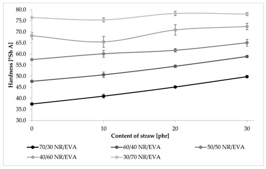 The hardness of all samples was in the range of 37–78 Shore A degrees (Figure 4). With the increase in EVA content, its value also increased, almost in a linear way. For samples containing 70 phr of NR and 30 phr of EVA, the hardness was about 40. In the case of samples with the inverse proportion, the hardness increased almost twice as a result of the higher content of the crystalline phase. The addition of straw also increased the hardness by several units for each of the tested blends. The reason for the higher hardness, in this case, was also the increase in the content of the crystalline phase because the cellulose that builds the straw fibers has a high degree of order.