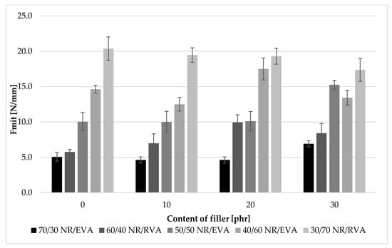 The study showed that there was a close relationship between EVA content and blend tear resistance (Figure 5). The higher the copolymer content, the greater the force needed to break the sample. The Fmit value of NR/EVA 30/70 samples was about 4 times higher than the NR/EVA 70/30 blend, almost regardless of the presence of straw. Samples containing more rubber had a tear strength of 5–7 N/mm, and with increasing EVA content, the strength increased up to 20 N/mm. The intermolecular interactions associated to the copolymer component (cohesive forces), as a result of its crystalline/glassy state at room temperature, are substantially greater than those within natural rubber microdomains and represents an appreciable energy barrier for incision propagation. The addition of straw also increased the tear resistance of composites. On average, the highest values were obtained for the addition of 20 phr of straw. In such a proportion, the fibers create a tear-limiting barrier that, when crossed, requires more force to be applied.