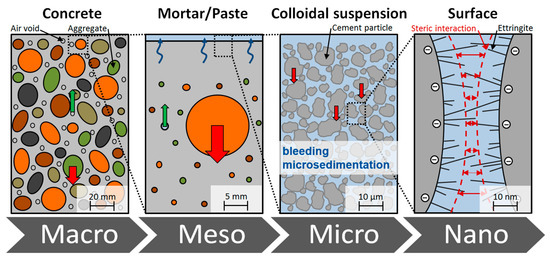 Illustration of concrete segregation phenomena on all scale levels of concrete, based on [2].