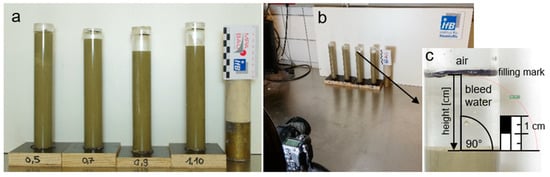 Due to the bleeding process, the samples separate into a (compacted) cement suspension layer in the lower section of the measurement cylinder and a growing bleed water layer in the upper section of the cylinder. Both layers were clearly separated from each other (see Figure 2c). Due to this separation, the w/c-ratio and the phase content in the sedimented cement suspension layer no longer corresponded to the w/c-ratio and phase content of the initial cement suspension. The corresponding in situ values can be calculated according to Equations (2) and (3).