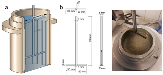 The rheological measurement was performed with a T-shaped rotor, consisting of a blade-like strip of stainless steel with a height of 6 mm and a thickness of 2 mm, connected to the bottom of a cylindrical axis, which is connected to the rheometer. This so-called T-rotor is shown in Figure 3b. The T-rotor is positioned relative to the filling height of the sample at any desired height by a precision step motor. Hereby, the bottom of the measurement cell designates the position level 0 mm. In this research, the position of the rotor given in mm designates the clear distance between the T-rotor and the bottom of the measurement cell.