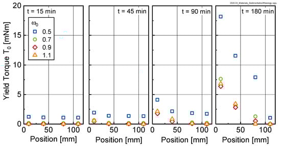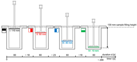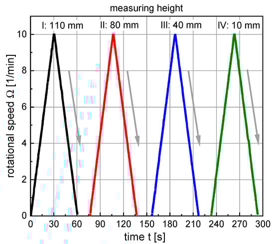 A graphical illustration of the four different measurements per sample age is shown in Figure 5 (note: color and symbol of the respective measurements). The immersion depth of the measuring paddle at the beginning of the rheometer measuring program was 110 mm. After completion of the first ramp element, the measuring paddle was vertically moved to a height of 80 mm. To avoid any disturbances of the suspension-structure the paddle was moved downwards with a very low velocity of approximately 2 mm/s. Correspondingly, the second ramp element started approximately 18 s after the end of the first segment, when the T-rotor had reached its new position of 80 mm. The procedure was then repeated at the third measuring height of 40 mm and finally at the fourth measuring height of 10 mm. The measuring sequence from top to bottom (110 mm–80 mm–40 mm–10 mm) was chosen so that any vertical transfer of particles by the measuring paddle occurred in the sedimentation direction and not in the opposite direction. Repeatability measurements clearly proved that due to the chosen geometry of the T-rotor (i.e., the very small width of the blade and the small diameter of the axis) such a vertical displacement of particles and thus an influence of the measurement on sedimentation could be neglected.