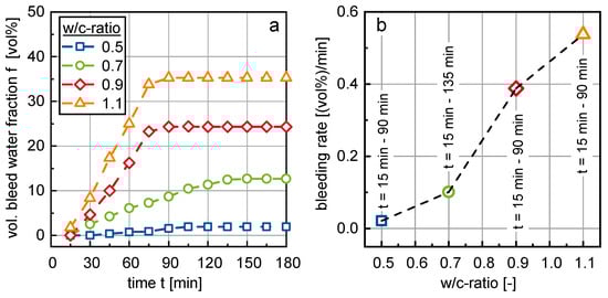 All samples reached an equilibrium plateau of bleed water, depending on their w/c-ratio, at which the amount of bleed water did not increase further. In order to evaluate the velocity of the water separation process, the bleed curves from the start of the bleeding process (i.e., at t = 15 min) until the end of the bleeding process (i.e., when the curves reached the above-mentioned plateau) were fitted by a linear regression function. Figure 6b shows the slope of the bleed curves, in the following designated as the bleeding rate. The bleeding rate could be seen as approximately in linear dependence of the w/c-ratio.