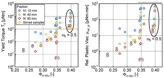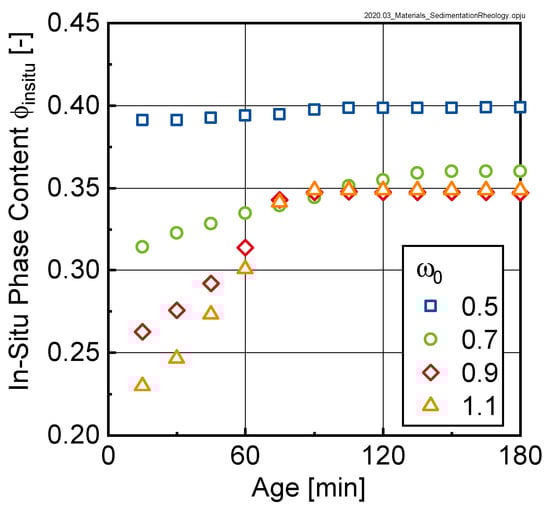 For the first group, the rheological properties increased with increasing phase content up to a limit phase content of approximately 0.35 (compare Figure 7). When this limit phase content was reached, a pronounced increase in the rheological properties (note logarithmic scaling) could be observed, which however was not reflected in changes of the in-situ phase content. This was explained by the fact that as calculated according to Equation (3) only accounted for the segregated water (i.e., the bleed water) but did not consider the gradient in the sediment itself. Interestingly, samples with ≥ 0.7 even in the sedimented state did not seem to reach the same packing density as the sample with = 0.5. For this second group, also here the rheological properties seemed to be influenced by the phase content.