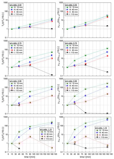 Figure 8 shows the temporal development of the yield torque and the relative plastic viscosity of cement suspensions (w/c-ratios: 0.50, 0.70, 0.90 and 1.10) at four measuring heights (I–IV) within the sample. The rheological measurements on the cement suspensions were carried out as described in Section 2.3. The values for the yield torque and the relative plastic viscosity for each position were normalized by the corresponding value at a sample age of 15 min (reference state). As can be seen, the rheological values increased continuously with time with some exceptions. These exceptions primarily occurred in strongly sedimenting cement suspensions with w/c-ratios of 0.90 and 1.10, respectively. Here, the thickness of the bleed water layer quickly reached values that were large enough, as for some measurements (especially for positions I and II) to occur in pure bleed water instead of cement paste.