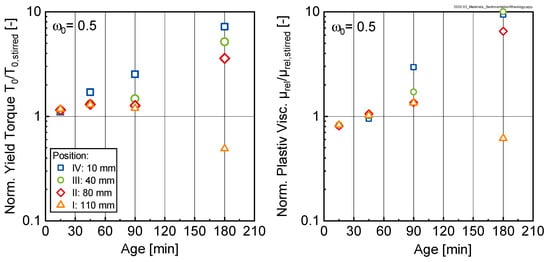 As can be seen in Figure 9, for the considered sample with = 0.5, the normalized yield torque and the normalized relative plastic viscosity in the sedimented layer (position IV: 10 mm) increased exponentially with time. However not all positions in the paste seemed to be affected in a similar manner. For this cement paste ( = 0.5) the lowest layer (i.e., position IV) seemed to compact continuously whereas for the adjacent layers III, II and I the compaction process stagnates after some initial set before becoming more pronounced in these layers after 180 min.