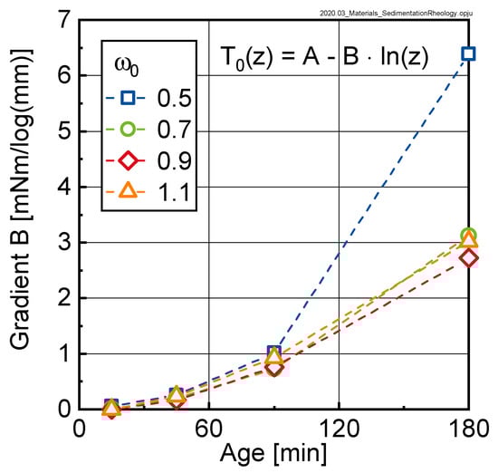 Gradient B according to Equation (4) of the yield torque T0 vs. height z curves (see Figure 10) as a function of sample age for the investigated pastes (initial w/c-ratios 0.5, 0.7, 0.9 and 1.1).
