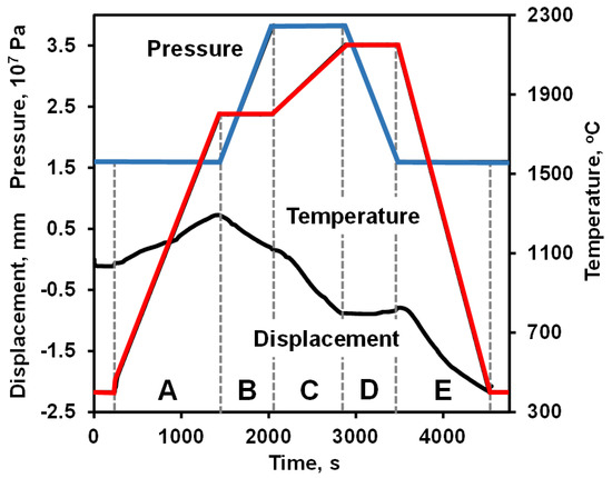 Figure 1 shows the shrinkage of B4C ceramic during Spark Plasma Sintering together with the pressure and temperature profiles, as a function of sintering time. The sample was heated from 400 °C to 1800 °C in 20 min under a minimal pressure of 16 MPa, then dwelled for 10 min during which a pressure of 40 MPa was fully applied, then the temperature was increased to 2150 °C and dwelled at this sintering temperature for 10 min before cooling down to room temperature. To protect the sample from fracture, the 40 MPa pressure was decreased at the beginning of the dwell time at 2150 °C in a such way that it reduced back to 16 MPa in 10 min by the end of dwell. As can be seen in Figure 1, expansion of the equipment was observed upon heating all of the way up to 1800 °C (region A, Figure 1) until the moment when the applied pressure was increased, causing shrinkage of the sample (region B, Figure 1). Under the constant pressure but with temperature increasing, most of the shrinkage of the B4C sample occurred (section C, Figure 1). When the sample dwelled at 2150 °C but with decreasing pressure, the shrinkage remained constant (section D, Figure 1), possibly because the majority of the densification process had already occurred. During cooling from the sintering temperature, shrinkage of the sample occurred (section E, Figure 1). After sintering, the samples were machined, surfaces polished and the density was measured to be equal to 2.50 ± 0.07 g/cm3 showing less than 1% of porosity.
