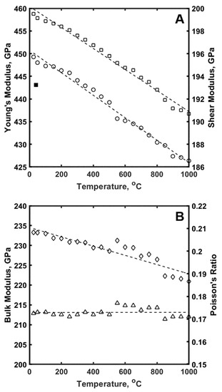 The results of the measurements of Young’s and the shear moduli along with bulk modulus and Poisson’s ratio by RUS as a function of temperature are shown in the Figure 5. The Young’s modulus of B4C measured by RUS was slightly higher compared to that measured using IE and was equal to 458.7 GPa at room temperature. The Young’s modulus decreased linearly upon heating in in vacuum and was 436.7 at 1000 °C. The shear modulus, also measured by RUS, was equal to 195.7 GPa at room temperature but slightly decreased linearly on heating to 186.5 GPa at 1000 °C. The bulk modulus and Poisson’s ratio were calculated from Young’s and shear moduli data and were equal to 220.9 GPa and 0.172 at 1000 °C. Note that Poisson’s ratio of B4C remains the same for the whole RT –1000 °C temperature interval (Figure 5B). All of the values of elastic properties of B4C presented in Figure 5 correspond very well with previously published data, where Young modulus was reported in the range of 440–560 GPa, shear modulus was reported in the range of 188–194 GPa, bulk modulus was reported in the range of 220–248 GPa and Poisson’s ratio was reported in the range 0.19–0.21 [94,95,96,97].