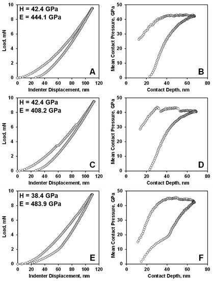 The maximum mean contact pressure under such conditions is about 43 GPa (Figure 7B), which corresponds very well to the average hardness values of 41.1 ± 5.7 GPa (Table 1). Some of the load-displacement plots obtained during nanoindentation of B4C exhibited one to three discontinuities during loading (Figure 7C). The presence of such pop-in events during nanoindentation is explained by transition from the elastic to elastoplastic deformation upon nanocontact in the imprint [55]. A second order phase transition in B4C was reported to occur at 32 GPa to 35 GPa due to reordering of polar atoms [99]. It was found that this second order transition, which is characterized by atomic site exchange with hysteresis, is a relaxation process that is reversible [100]. It was also predicted that both the chain bending of the three-atom carbon chain and disordering of the structure were detected above 70 GPa, where non-hydrostatic stresses are present. It was explained that the non-ideal structure of B4C can activate chain bending guided by polar carbon atom location in the icosahedron even at lower stresses above 38 GPa as observed in shock-wave experiments [101]. The discontinuities during nanoindentation of B4C occurred first at 43 GPa with a mean contact pressure decreasing to below 40 GPa during this first pop-in event occurring at a contact depth of 20 nm (Figure 7D).