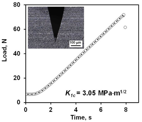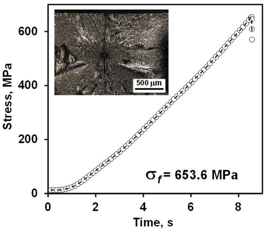 The region B in the Figure 11 depicts the stresses that are no longer uniform and by the end of region B, at the point when the sample has a contact with the support ring, the compressive stresses rise rapidly. However, it does not represent the critical condition and the values show that it is not a critical point of failure during testing. The stress distribution depicted by a numerical model are similar to those reported in a previous study of the biaxial strength of ZrB2- SiB6 ceramic composite [81]. The fracture toughness of B4C measured by SEVNB was equal to the 3 ± 0.19 MPa m1/2. The load vs. time plot used for the calculation of KlC is shown in Figure 12, while the insert shows an optical micrograph of the V-notch with the measured tip diameter equal to 2.1 µm.