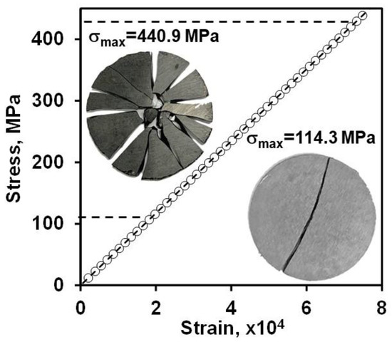 The average biaxial strength σb of B4C was measured to be 239 ± 122 MPa using a ring-on-ring configuration [81]. The typical stress-strain deformation behavior of B4C during ring-on-ring loading is shown in Figure 9. The two inserts show micrographs of B4C samples after failure. As expected, the samples that failed at relatively high loads were broken into multiple pieces after failure, while the samples that failed at low loads were broken into two pieces, as can be seen in the inserts Figure 9. It is not clear why the strength of B4C measured in 4-point bending and ring-on-ring tests were so different but the quality of the surface after machining likely to contributed to such low biaxial strength values.