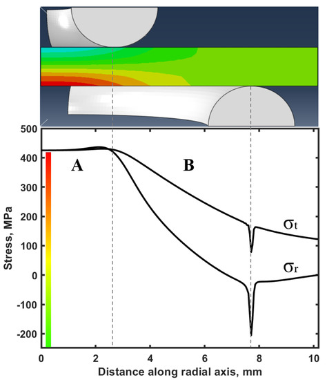 The maximum biaxial strength during the mechanical testing of B4C specimens came out to be 440 MPa with a maximum applied load of 1530 N, which was used for a numerical simulation. The stress distribution during biaxial ring-on-ring loading of B4C was modeled using Abaqus [81], which showed that the highest tensile biaxial strength occurred along the bottom surface of B4C specimen (Figure 11) and was equal to 436.1 MPa. The region A in Figure 11 represents the highest uniform tensile stresses at the polished bottom surface of B4C between the surface contact of the specimen and support-ring, as well as a high compressive strength which developed at the line of the contact of the B4C samples with the load-ring.