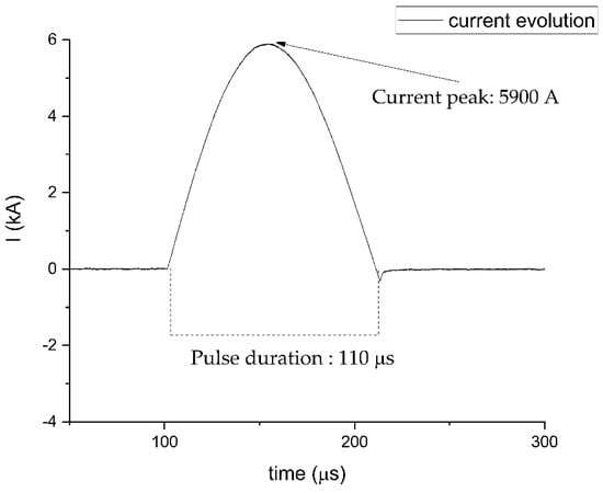 A self-designed power supply capable of delivering electrical pulses of duration of 110 µs at maximum frequency of 50 Hz and up to 6 kA were used for the electropulsing treatments. The waveform of the electrical current is displayed in Figure 1. The temperature of the specimens was collected through a FLIR A40 infrared camera. The side of the specimen facing the infrared camera was painted with a black opaque lacquer in order to obtain a uniform emissivity distribution.