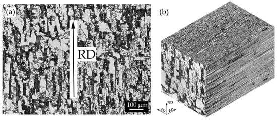 Microstructure of the as received materials: (a) along the rolling direction (RD) and (b) along the main three directions (b). Etching solution NaOH at 3 V and 5 s.