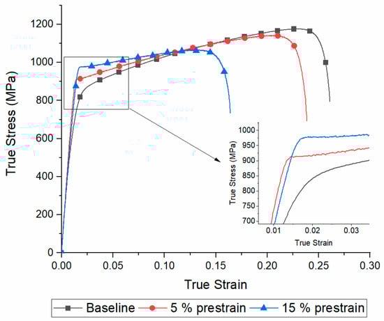 True stress-strain curves of the as received material and the two categories of specimens prestrained at 5% and 15%.