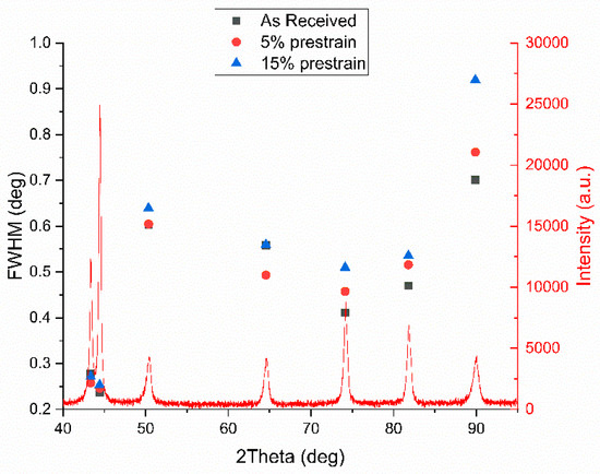 Peaks broadening is affected by dislocation density, microstrain, stacking faults, crystallite size etc. [41,42,43,44,45,46,47]. It is therefore very difficult to separate the contribution of each phenomenon, so raw FWHM values are considered. As expected, as the prestrain increased FWHM increased too, because of the higher dislocation density, the generation of stacking fault in the austenitic phase, the evolution of the crystallite size due to dislocation network, etc. The higher the prestrain the higher the microhardness as well (Figure 7).
