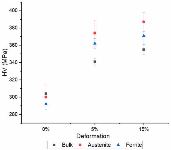 Microhardness of the bulk material was lower compared to that of the single phases because it was measured with a higher load. The smaller the load the more the measure is affected by the metallographic preparation which produces a shallow work hardened layer at the surface not to mention the indentation size effect. As the prestrain increased, the microhardness of the austenitic phase increased due to its higher strain hardening rate because of the lower YS in comparison to that of ferrite [48,49].