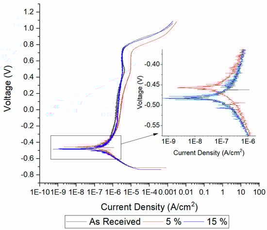 Corrosion properties were not substantially affected by the degree of prestrain as can be seen in Figure 8, where the potentiodynamic polarization plots of the as received and prestrained at 5% and 15% samples are shown. The only observed effect was the raise in corrosion potential of the 5% prestrained specimen in comparison to the others. No effect on the corrosion current were observed.