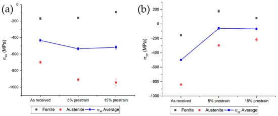 Compressive stresses in each phase along the two directions were measured, conversely to what Johansson et al. found [40]. A decrease in the compressive stress values for both phases were determined since the specimens were strained along the transversal direction (Figure 9b). The average stress was computed with the rule of mixture according to [40]. Compressive stresses along in single phases along rolling direction increased in austenite and decreased in ferrite. Average residual stress remained almost constant as expected since a tensile test produces the superposition of a uniaxial stress condition on the previously existing stresses distribution in the specimen.