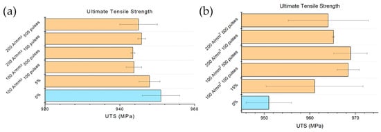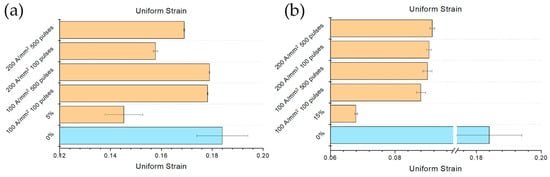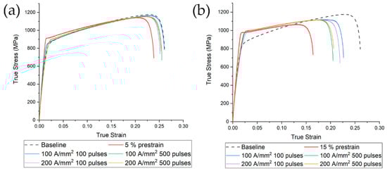 Ultimate tensile strength was affected to a much lesser extent by both prestrain and by the electropulsing treatment. As can be seen from Figure 12a, 5% prestrain had no effect on the UTS while the electropulsing treatments caused a slight decrease of UTS in comparison to that of the prestrained material. As opposed to what expected, the electropulsing treatments increased UTS in the case of the sample strained at 15% (Figure 12b). This is because the uniform strain of the reference specimen (εu = 0.184) was very close to the value of the prestrain applied to the specimens of category two (ε = 0.15). Therefore, electropulsing treatments were able to recover a lot in terms of fracture strain, allowing the material to accept a higher amount of deformation, hence increasing its ability to work-harden which consequently led to higher UTS.