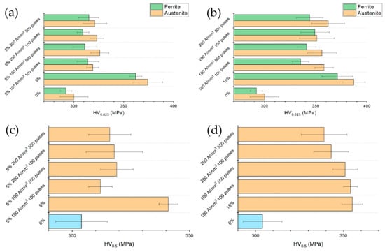 Single phase hardness and bulk hardness of specimens strained and electropulsed at (a,c) 5% and (b,d) 15% compared to the baseline (0%) and the related reference tests.